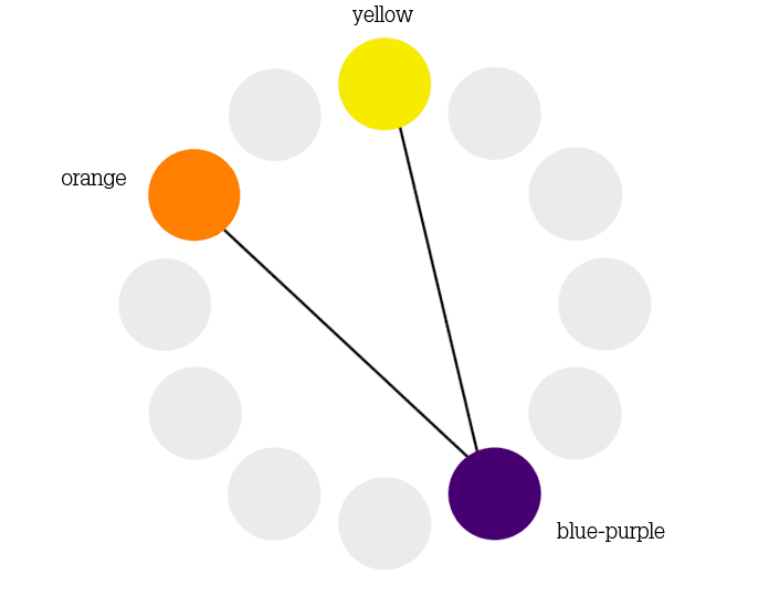 A split complement is the combination of one hue + the two hues on each side of its complement.